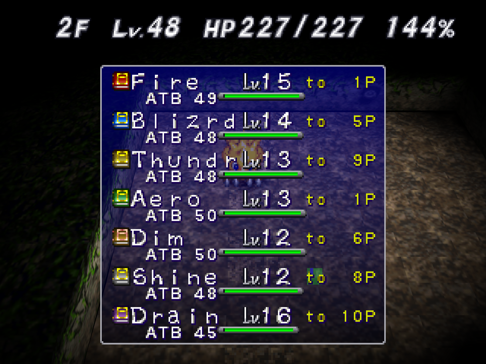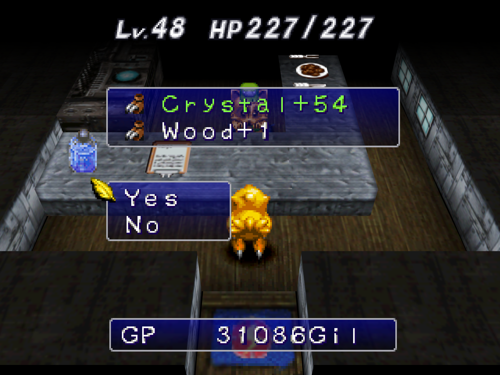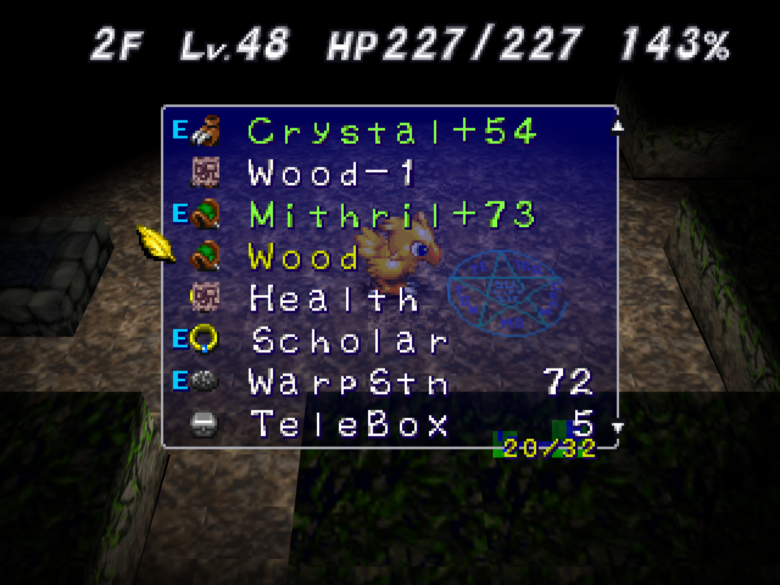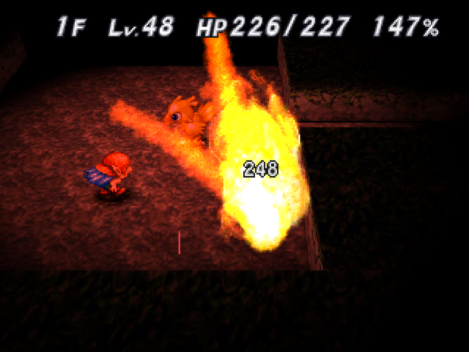 Le dernier type d’objets fait appel à un concept que je n’ai pas encore mentionné : la faim. Notre chocobo ne peut pas parcourir tous ces couloirs et salles sans perdre d’énergie. Pour la remonter, il suffit de manger différentes graines trouvées durant nos explorations. Elles arrivent également non identifiées dans notre inventaire, et certaines ont des effets supplémentaires en plus de nous rassasier. Comme toujours, ces effets peuvent parfois être indésirables.